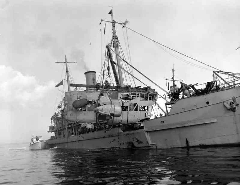 K-6 mooring shackle ripped out and hanging on mast July 6, 1942K-6 wrecked by storm July 6, 1942