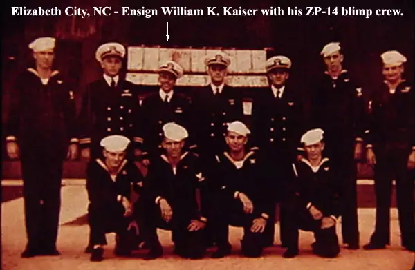 Also pictured are Ensign Warren H. Ireland, standing fourth from left, and Aviation Radioman Second Class Paul Galbreath, standing on the far right. Ensign Kaiser was a co-pilot on airship K‑123, the first blimp to take-off from the Azores and the second blimp to land at Port Lyautey on June 1, 1944, completing the final leg of the first transatlantic crossing by non-rigid airships.