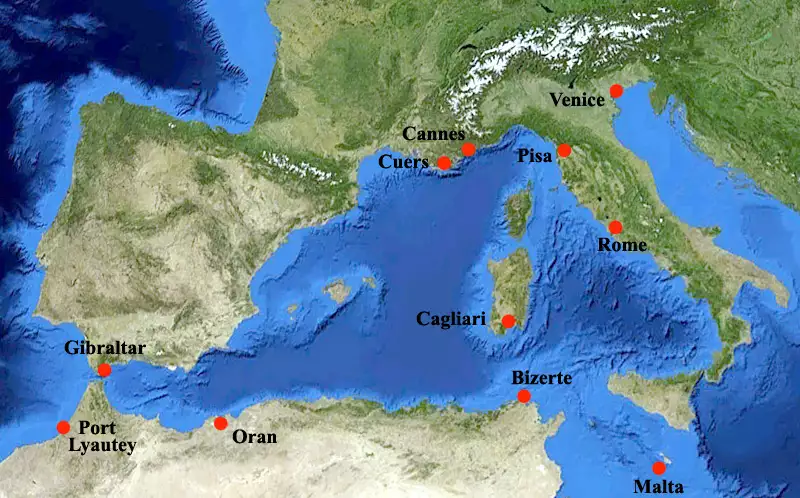 The first six blimps (K‑ships) traveled the northern route (see map above). Blimps K‑123 and K‑130 were the first to go. They left South Weymouth Naval Air Station (NAS) in Massachusetts about 8:00 PM EDT on May 28, 1944 and flew ~16 hours to Argentia, Newfoundland. The next day, fresh crews flew the blimps ~22 hours to Lagens (Lajes) Field on Terceira Island in the Azores. The final crews including ZP-14 Squadron Commander Emmett J. Sullivan, who piloted K‑130, flew about 20 hours from the Azores to Craw Field at Port Lyautey, French Morocco (now Kenitra, Morocco).